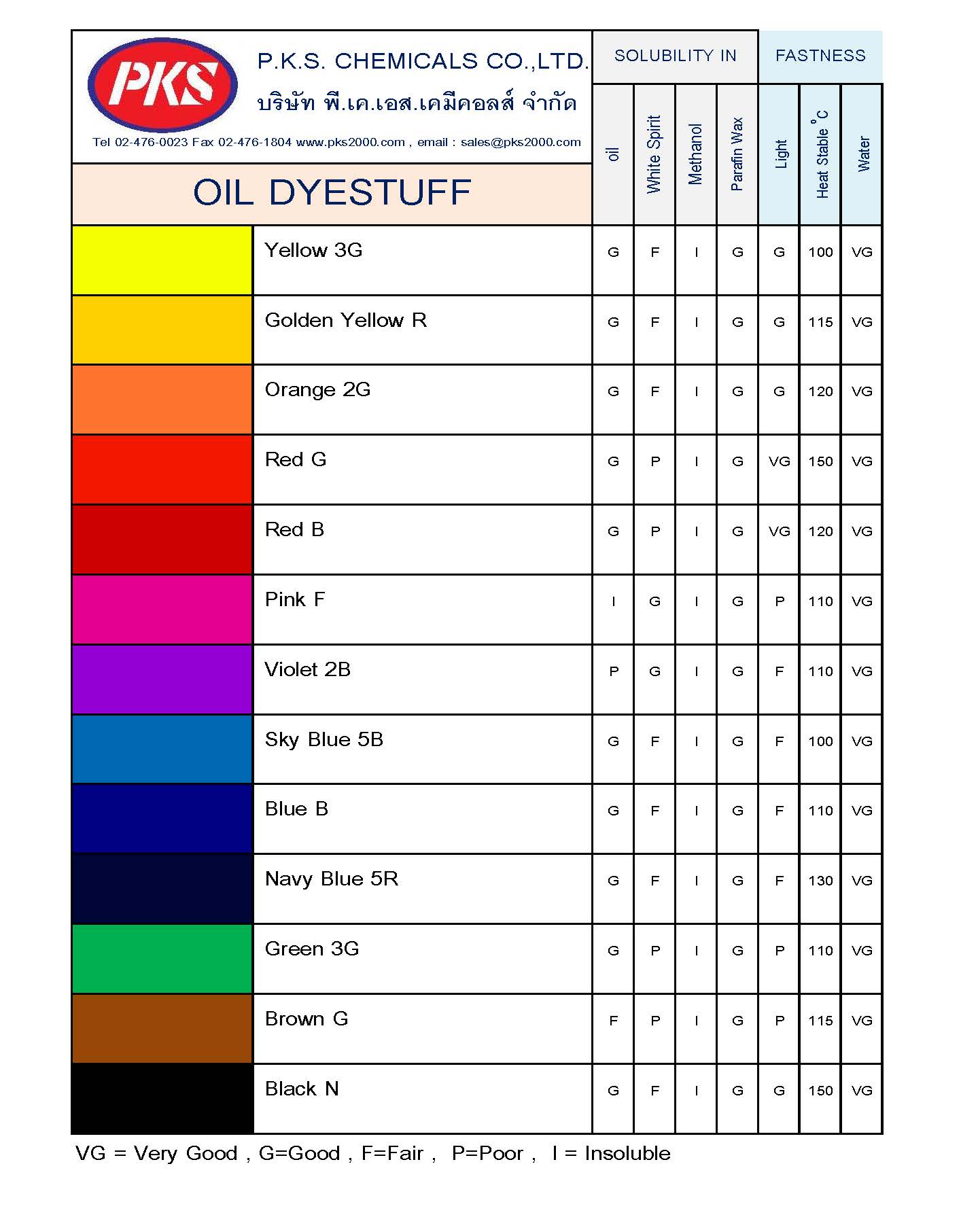 Oil Dyestuff สีละลายน้ำมัน ใช้สำหรับเพิ่มสีสันให้ผลิตภัณฑ์น้ำมันของท่านมีความแตกต่าง สวยงาม น่าใช้ยิ่งขึ้น ใช้ได้กับน้ำมันหลายประเภท เช่น น้ำมันเครื่อง น้ำมันเบรก น้ำมันเบนซิน น้ำมันดีเซล น้ำมันก๊าด พาราฟิน เทียน น้ำมันสน ทินเนอร์ น้ำมันพืช น้ำมันปาล์ม น้ำมันถั่วเหลือง น้ำมันรำข้าว